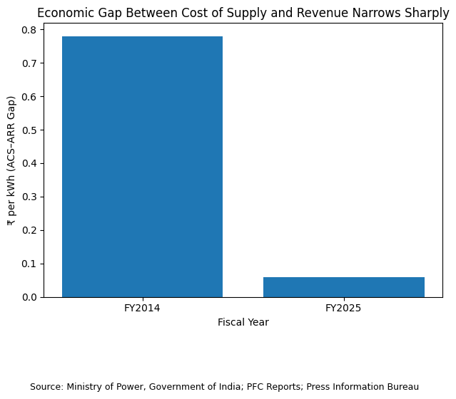 Between FY2013–14 and FY2024–25, AT&C losses declined from 22.62% to 15.04%, and the ACS–ARR gap shrank from ₹0.78 per kilowatt-hour to just ₹0.06.