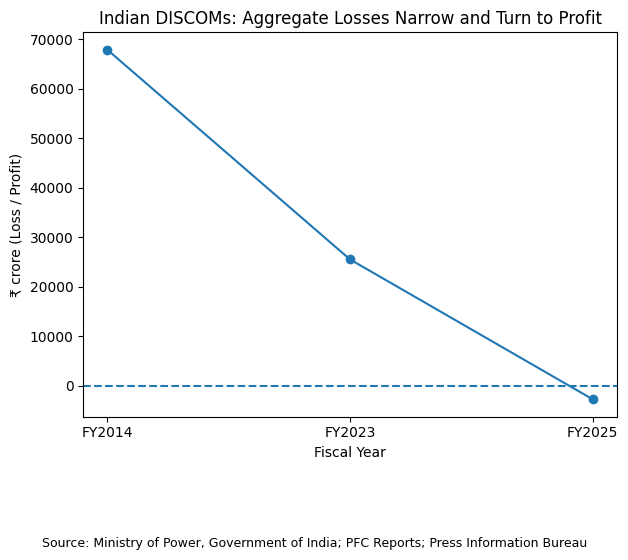 Under the Ministry of Power’s official accounting, the combined profit after tax (PAT) of all DISCOMs and state power departments stood at ₹2,701 crore in fiscal 2024–25. This is a remarkable reversal from a ₹25,553 crore loss in FY2023–24 and the far larger ₹67,962 crore loss in FY2013–14.